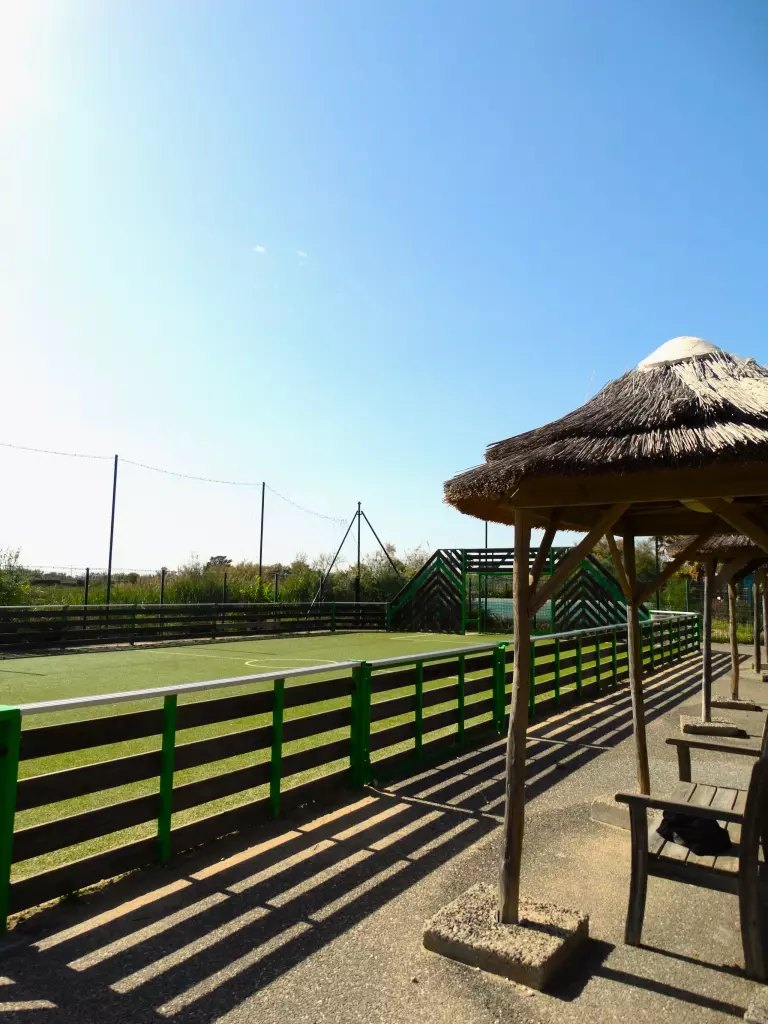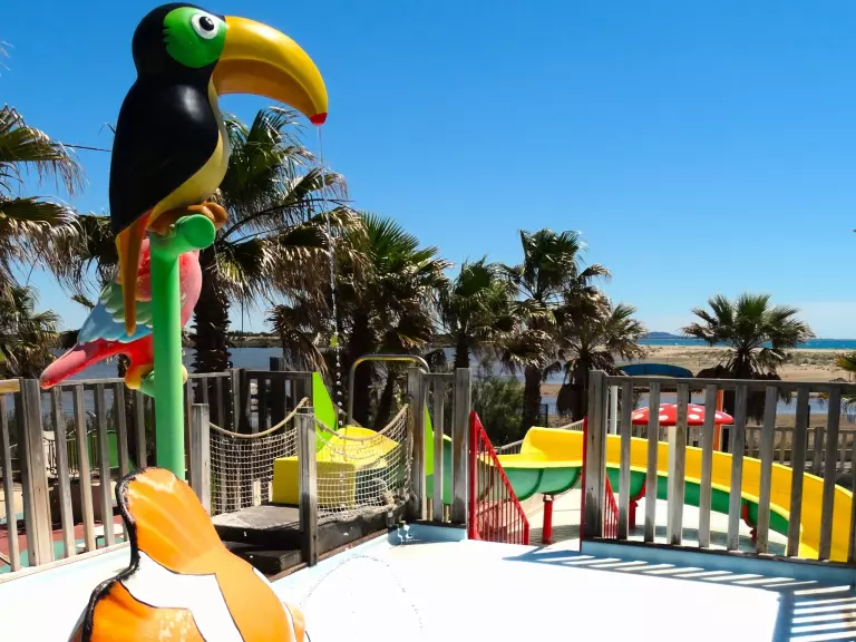Sur 700 mètres carrés, face à l'étang et à la mer, sur le plus bel emplacement du Camping Bleu marine et non dans un ‘coin' comme bien souvent, cette aire de jeux ne ressemble décidément à aucune autre.