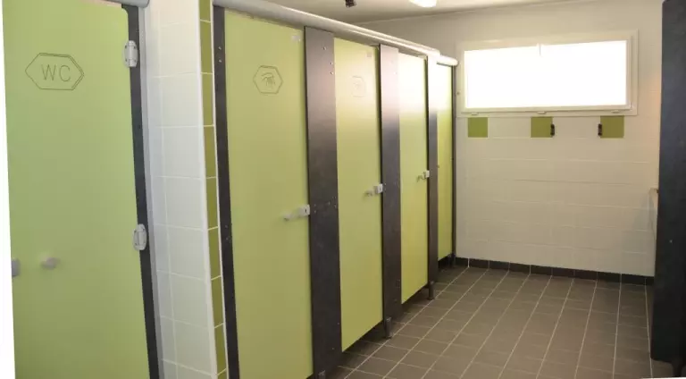 Sanitaires neufs, 7 douches, 7 wc, 14 lavabos, espace bébé, Laverie avec bacs vaisselle et linge, machine à laver à disposition