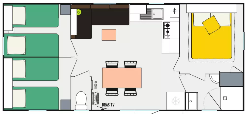 - Lit bébé : (matelas fournis) 5.50€/jour sur réservation uniquement et selon disponibilité (2 nuits minimum en basse saison et 7 nuits minimum en haute saison) - à régler sur place