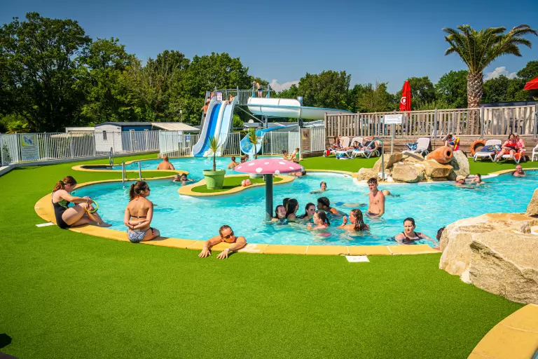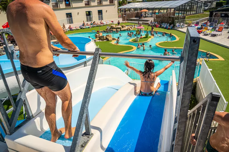• Espace aquatique avec piscine extérieure chauffée (150 m²), toboggans spirale, pentaglisses et pataugeoire