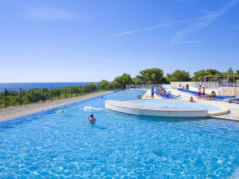 Magnifique piscine extérieure à débordement de 560 m² avec une vue panoramique incroyable sur la mer et la côte ; les plus jeunes ne sont pas oubliés avec la pataugeoire accolée.