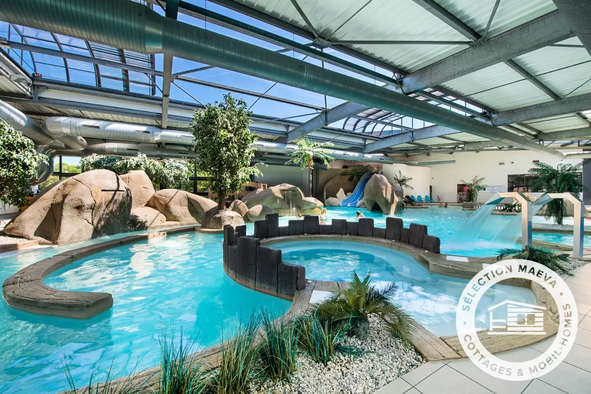 - Espace aquatique couvert chauffé avec rivière à contre-courant, bains bouillonnants, toboggans, pataugeoire et équipements balnéo