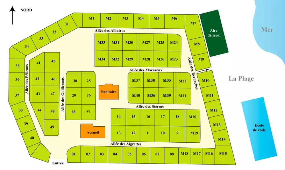 Il dispose de 83 emplacements, dont 43 emplacements touristiques de 90 à 100m² délimités par des haies qui assurent la tranquillité de nos campeurs et 40 emplacements loisirs pour mobil-home