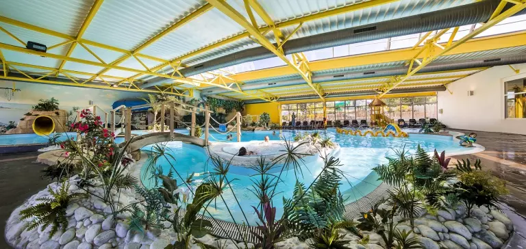 Sur place, vous pourrez profiter de l'espace aquatique couvert et chauffé à 29° toute la saison, avec piscine, bain bouillonnant, rivière à contrecourant, toboggan, pataugeoire aménagée, sauna et hammam en accès libre.