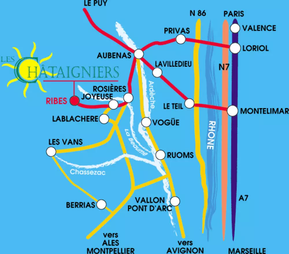 Le Camping les Châtaigniers se trouve dans la vallée Beaume – Drobie à 5 kilomètres de Joyeuse, 20 Km de Vallon Pont d'Arc, des gorges de l'Ardèche, de Ruoms, d'Aubenas, au cœur du parc naturel régional des monts d'Ardèche.