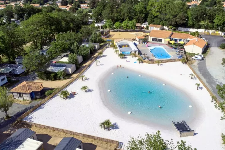 - Lagon tropical de 3000 m² avec plage de sable et palmiers