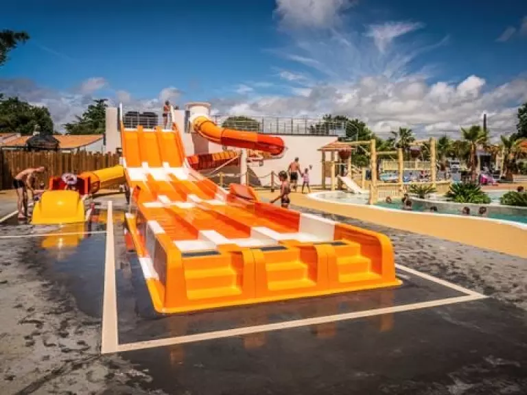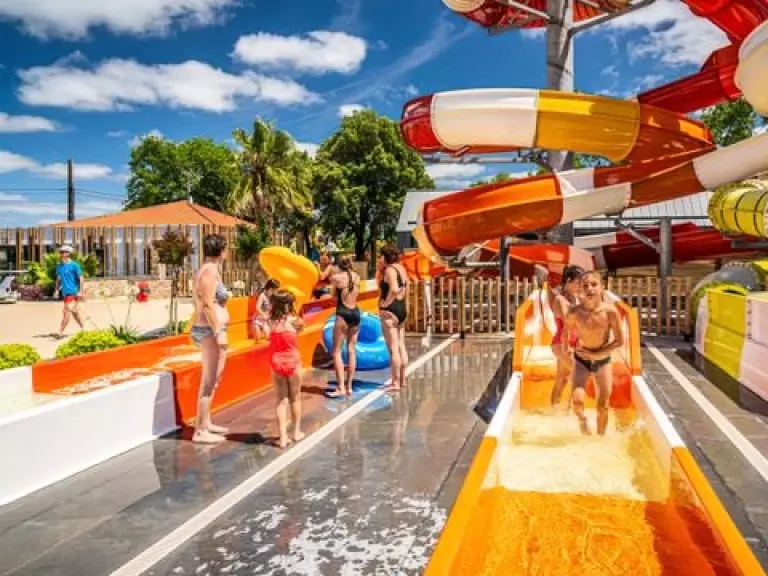 Vient s'ajouter un dernier espace avec 2 autres piscines extérieures chauffées, bain à remous, rivière de marche, pataugeoire chauffée, solarium et 7 pistes de toboggans dont un à bouées pour le plaisir des grands et des petits.