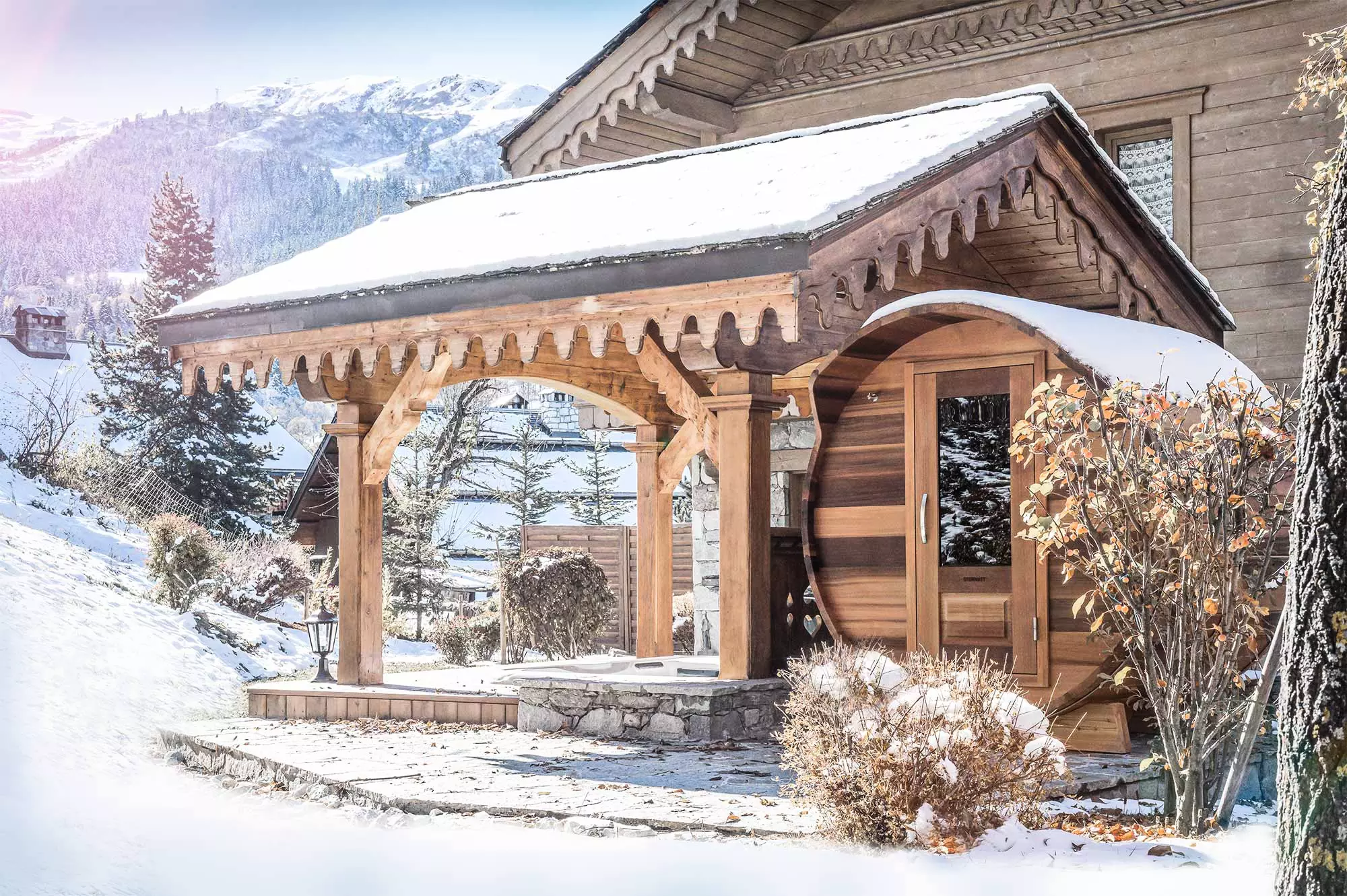 À l'extérieur du salon, il y a une terrasse spacieuse, avec une vue imprenable sur la station de Méribel et les sommets montagneux. A côté de la terrasse, vous trouverez un jacuzzi extérieur, l'endroit idéal pour savourer un petit verre et regarder le soleil se coucher derrière les montagnes. De plus, il vous permettra de vous relaxer après une longue journée passée sur les pistes de ski. Le jacuzzi est situé sous un auvent dédié, ce qui permet d'être à l'abri en cas de mauvais temps.
