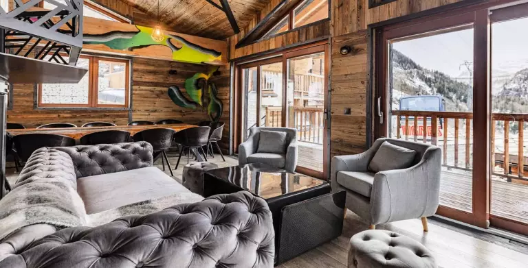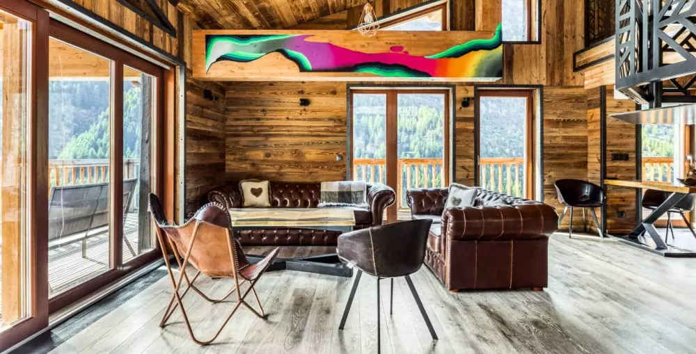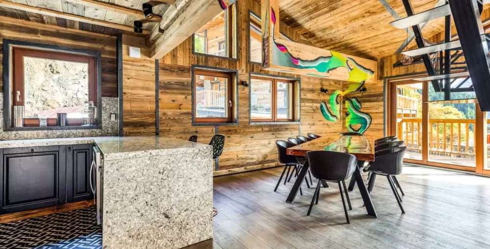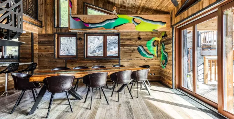 Sa décoration éclectique subtile mélange bois et pierres traditionnels alpins a des couleurs décalées et des tags du collectif d'art urbain savoyard Les Éternelles Crapules. Ce qui en fait un lieu rare avec une personnalité forte au confort voluptueux. Un diamant !