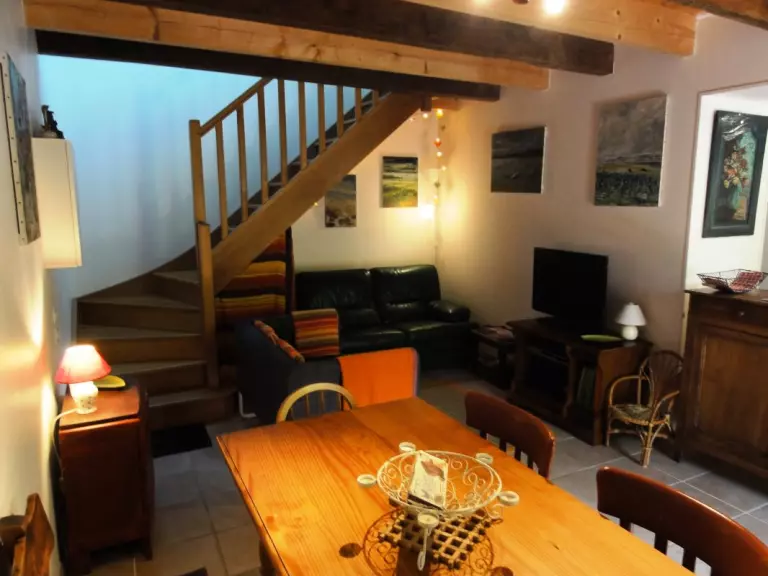 Maison mitoyenne à celle du propriétaire. Cour close privée. Salon de jardin. transat. Barbecue. Abri. Séjour coin-cuisine. 1 chambre (1 lit 140). 1 chambre (2 lits 90). 1 lit bébé sur demande. Salle d'eau. wc. TV. Internet wi-fi. Lecteur DVD. Lave-linge. Lave-vaisselle. Chauffage électrique en supp. Linge de maison non fourni. Draps en location. Service ménage en supp Le charme de cette petite cour privée est indéniable, notamment au printemps lorsque la glycine est en fleurs! Une adresse attachante où de multiples tableaux colorés appartenant à la famille agrémentent son intérieur. Possibilité d'accueil en gare SNCF (Granville ou Coutances).