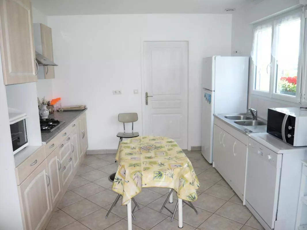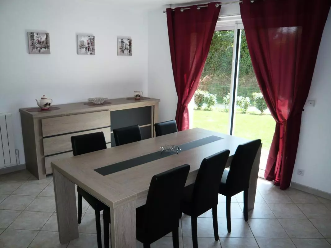 Maison indépendante. Séjour. Coin-cuisine. Buanderie. RDC : Chambre 1 (1 lit 140) ETAGE : Ch2 (1 lit 140) Ch3 (2 lits 90). Lit bébé. Chaise haute. Salle de bain. Salle d'eau. 2 wc. TV. Cheminée (Insert). Bois fourni. Lave-linge. Lave-vaisselle. Chauffage électrique en supplément. Draps et linge de maison en location. Service ménage en supp. Terrain clos privé. Terrasse. Salon de jardin. Barbecue. Garage. Parking. A deux pas du centre-ville au sein d'un quartier résidentiel, cette maison confortable est dotée d'un garage et d'un bel espace vert pour la détente. A quelques minutes de la plage de sable de Barneville et du Cap de Carteret.