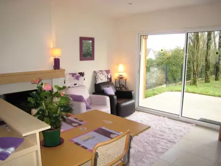 Maison indépendante entièrement en rez-de-chaussée. Séjour. Coin-cuisine. 1 chambre. 1 lit 160. 1 canapé convertible. Salle d'eau. Wc. Cheminée insert. TV. Wifi. Lave-linge. Draps et linge de maison en location. Chauffage électrique facturé en supp. Terrain clos commun. Terrasse. Salon de jardin. Barbecue. Garage. Sur le domaine des propriétaires, cette petite construction contemporaine fait face à un joli verger. M et Mme Durandière vous accueillent dans un intérieur très soigné aux tons pastels.