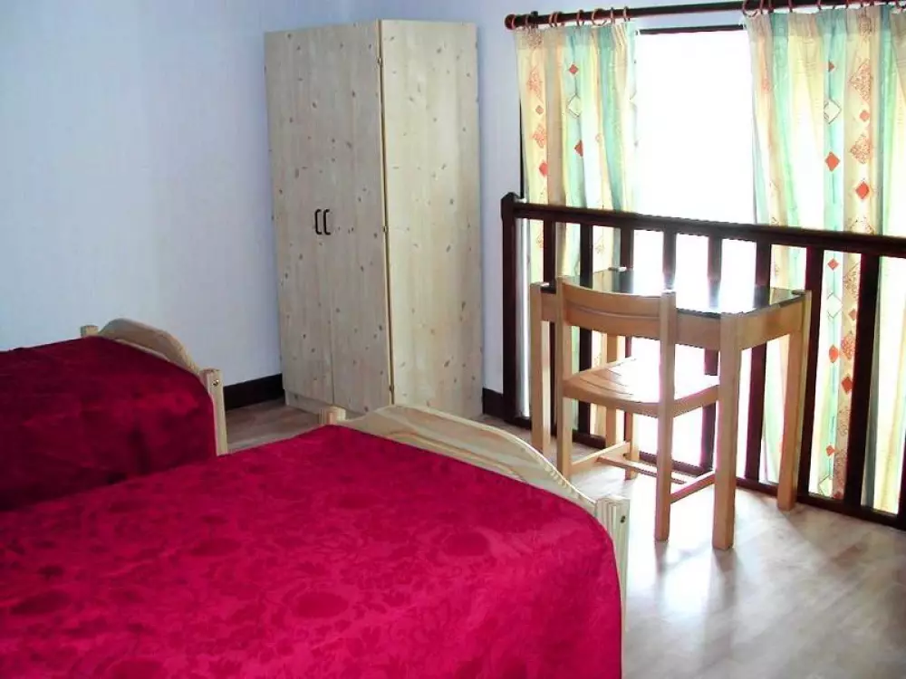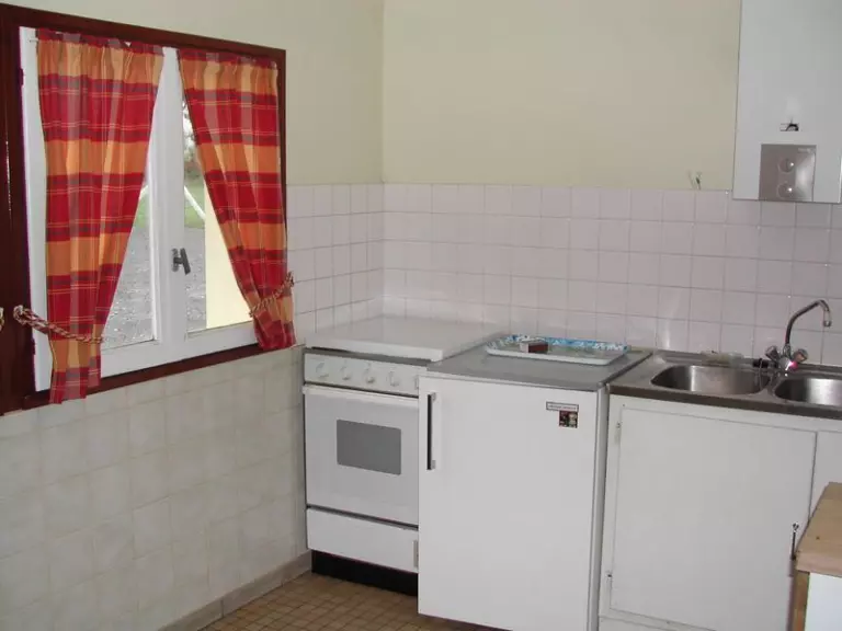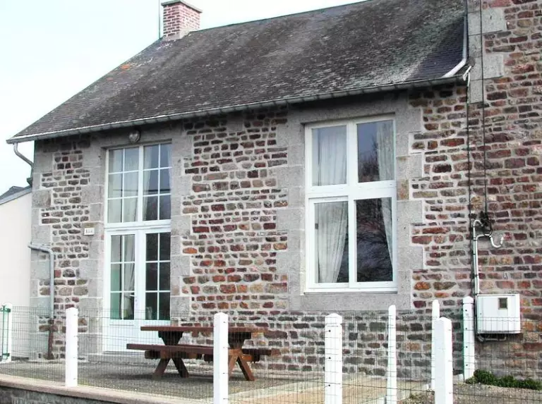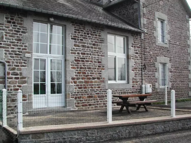 Maison mitoyenne à une autre location. Séjour. Cuisine. Mezzanine. 1 chambre. 1 lit 140. 2 lits 90. Salle d'eau. Wc. TV. Draps et linge de maison non fournis. Chauffage électrique en supp. Cour close privée. Table pique-nique. Dans l'ancienne école du village, deux logements aménagés simplement. Situés aux confins du département à quelques kilomètres de la Bretagne.
