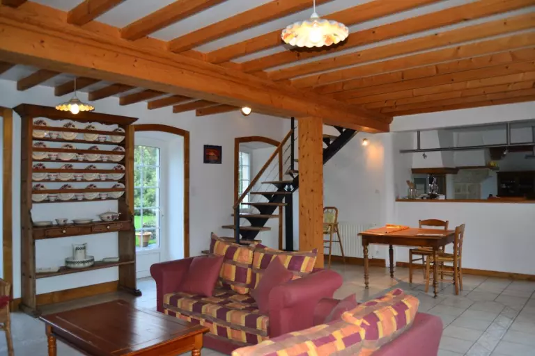 Maison mitoy. à une habitation. RDC: Séjour. Coin-cuisine. S.eau. WC. Cheminée. TV. Lecteur DVD. Tel. Téléséjour. L.linge. L.vaisselle. Sèche- linge. Etage: 3 CH avec 1 lit de 140. 1 CH avec 2 lits de 90. 1 lit bébé. 1 CH avec 1 lit de 90. Salle de bains avec WC. Draps en location. Serv. ménage en supp. Chauf. central compris. Terrain clos privé. Cour close privée. Terrasse close. Salon de jardin. Barbecue. Dans ce vallon boisé au coeur du Val de Saire, cette volumineuse longère vous accueille. Le coin cuisine divise l'unique pièce au RDC en 2 espaces: repas et salon, dotés chacun d'une cheminée. En plus de la pelouse à l'arrière, possibilité de vous détendre dans le verger situé au- dessus.