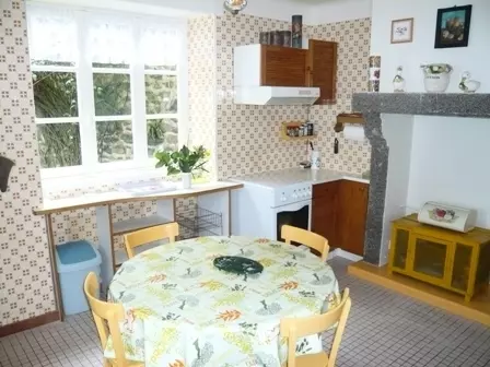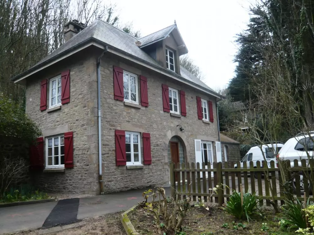 Maison indépendante. Séjour. Cuisine. 3 chambres. 2 lits 140. 1 lit 90. Salle d'eau. Wc. Prise TV. Tél. téléséjour. Lave-linge. Lave vaisselle. Draps et linge de maison en location. Service ménage en supp. Chauffage central compris. Terrain non clos privé. Salon de jardin. Terrain de pétanque. Garage. Pièce d'eau. Non loin des falaises de Landemer, ce gîte entouré de pins est une maison en pierre construite en 1914 par le Comte De Jametel pour y loger son garde. La propriétaire vous fera partager ses passions: pêche, cuisine et randonnée! Accès direct à la mer.