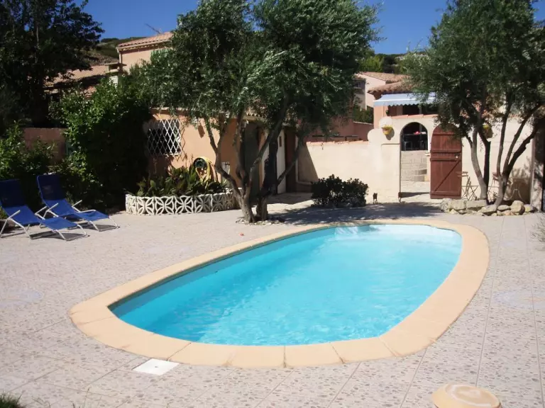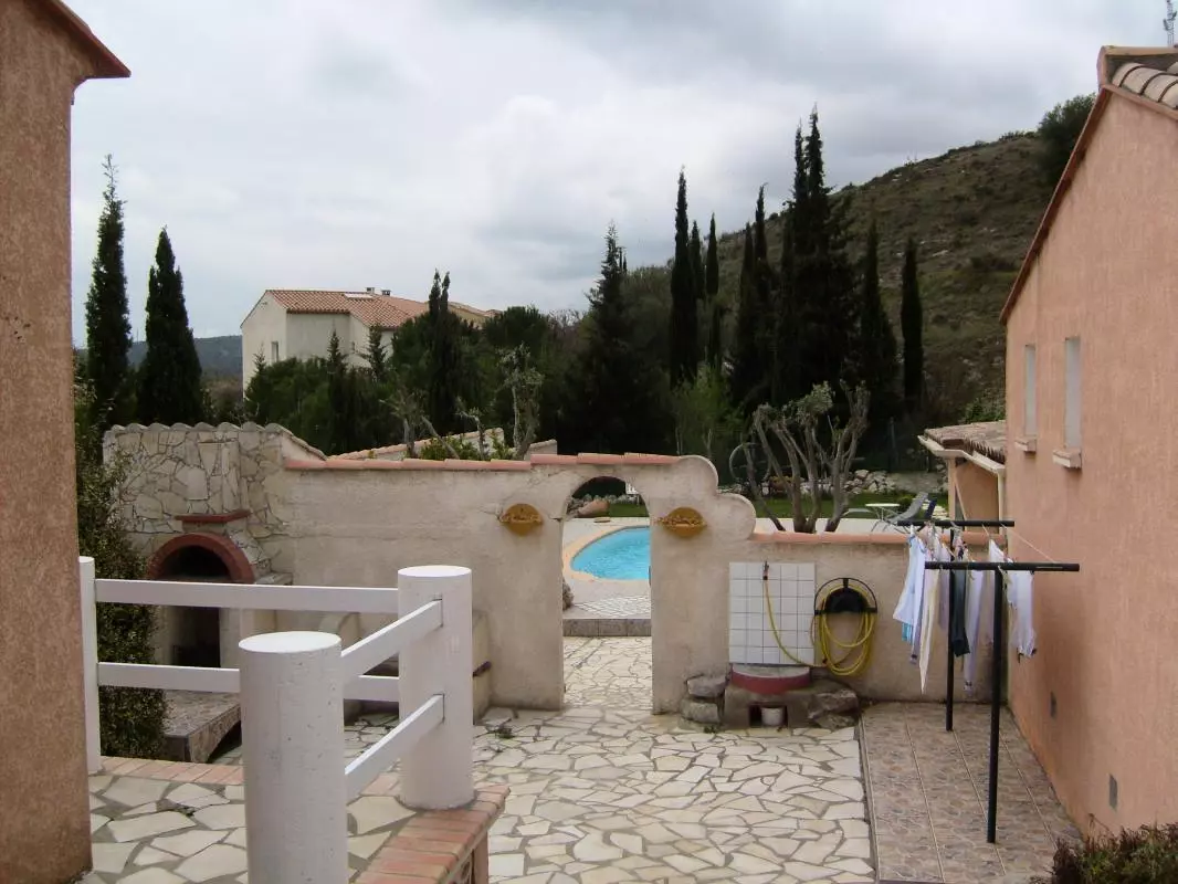 Séjour-cuisine avec cheminée. 2 chambres 2 lits90 et 1lit 160. Salle de bains, wc. A l'étage mezzanine avec 1 lit 160 ,wc. Garage buanderie LL et SL. Equipements BB. WIFI dans le gîte de mai à septembre. Chauffage central forfait 70? semaine. Maison de vacances située dans un quartier calme du village, prés de Narbonne, à 20 mn des plages. Villa individuelle bien exposée avec terrain attenant clos de 600m², terrasse de 30m2 avec BBQ(salon de jardin). Garage. Piscine privative 7 x 3 securisée. Parc Naturel de la Narbonnaise à proximité. Commerces au village. Parking dans la propriété.