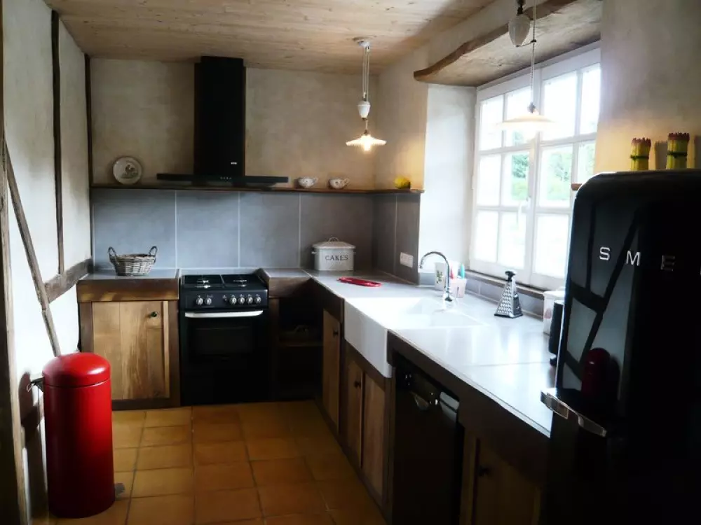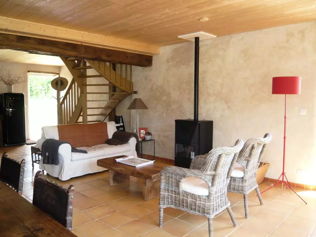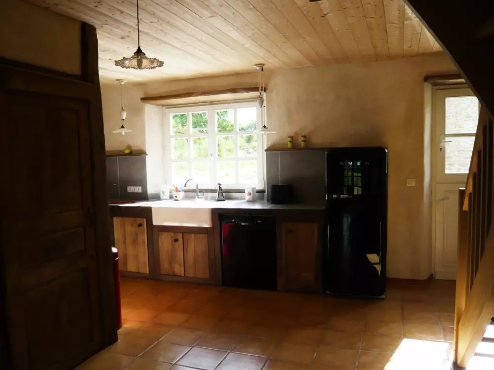 Maison indépendante. Séjour. Coin-cuisine. Chaine-HIFI. Lave-linge. Lave-vaisselle. Chambre 1 (1 lit 160). Chambre 2 (2 lits 90). 1 lit et 1 chaise bébé. Salle d'eau. 2 wc. Draps et linge de maison fournis. Lits faits à l'arrivée. Service ménage. Chauffage par poêle à granulés. Toutes charges comprises. Terrain privé non clos. Terrasse. Barbecue. Salon de jardin. Cellier. Vous succomberez comme nous au charme de cet ancien pressoir immergé dans un petit paradis végétal! Les propriétaires ne sont pas étrangers à cette opération séduction: passionnés de jardin et très respectueux de l'environnement, ils sauront vous faire partager leurs convictions et leur amour de la nature! Qualifié Ecogîte et Gîte au jardin, ce gîte est en effet remarquable dans sa conception, notamment par son intégration au paysage, la valorisation de nombreux matériaux de récupération, la gestion de l'eau, l'énergie solaire...