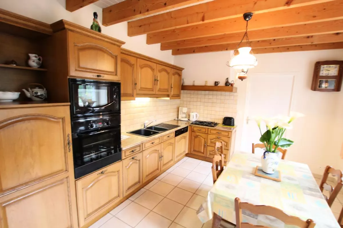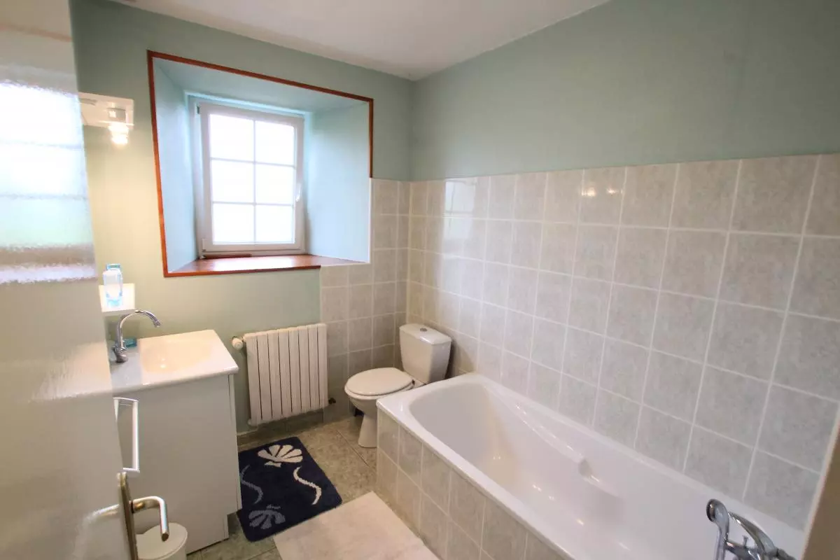 Maison indépendante. RDS : Sejour, Cuisine, 1 chambre (1 lit 140), salle d'eau, WC, buanderie, cellier. Etage : 1 ch (1 lit 140), 1 ch (1 lit 140), 1 ch (3 lits 90), 1 petite pièce avec 2 lits bébé et accessoires (2 chaises hautes), salle de bain, WC. Cheminée. TV. Lecteur DVD. Lave-linge. Lave-vaisselle. Draps et linge de maison en location. Chauffage central compris. Terrain clos privé(1000 m2). Salon de jardin. Barbecue. Portique. 6 vélos adultes et 3 vélos enfants à disposition.Réduction de 10% pour tout séjour de 2 semaines consécutives. Un espace vert agrémenté d'une pièce d'eau devance cette demeure en pierre. L'intérieur, de style rustique, est fonctionnel : avec par exemple une petite pièce à l'étage réservée pour le couchage des touts petits, ou une large pièce à côté de la cuisine servant de buanderie et débarras.