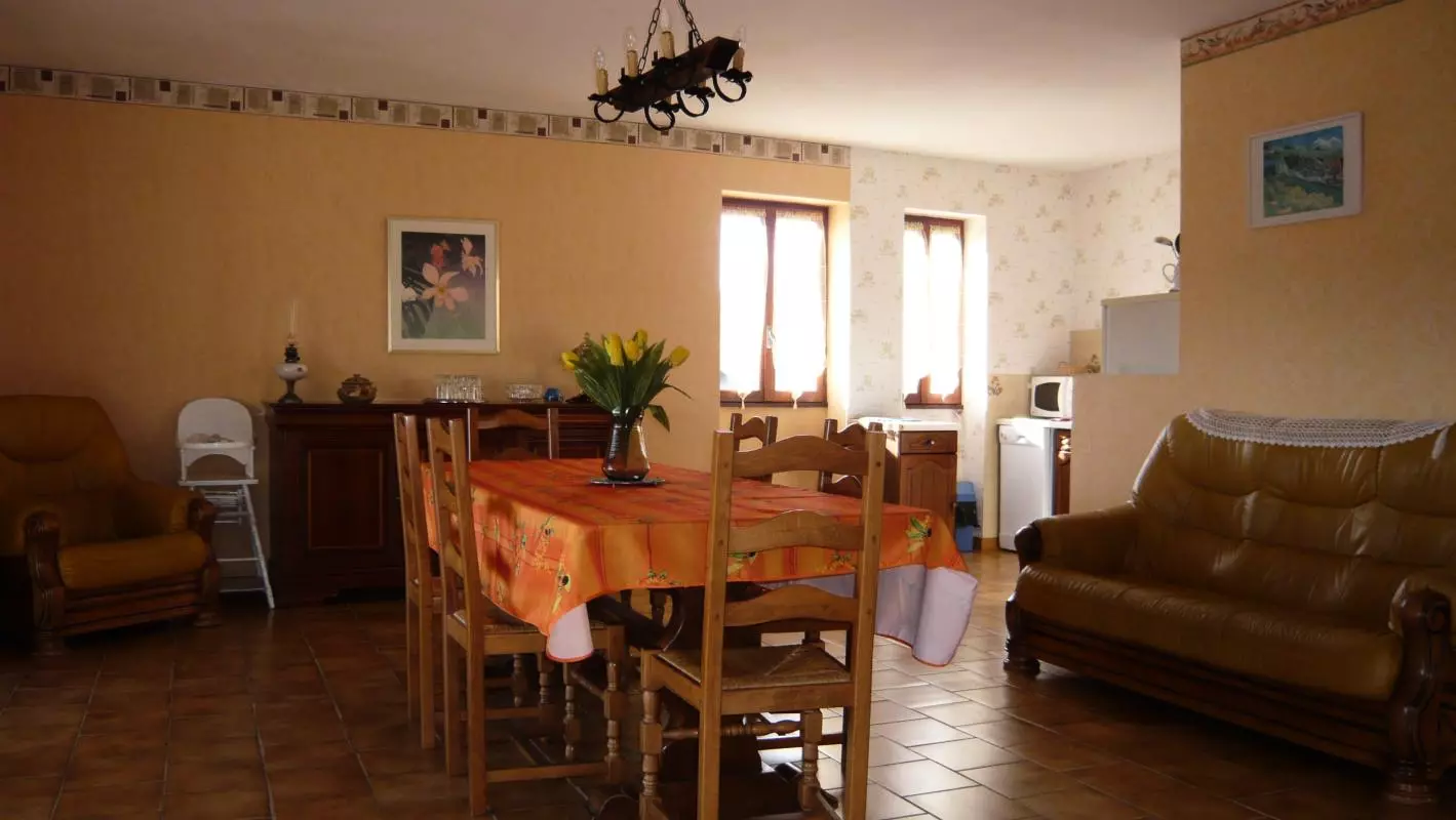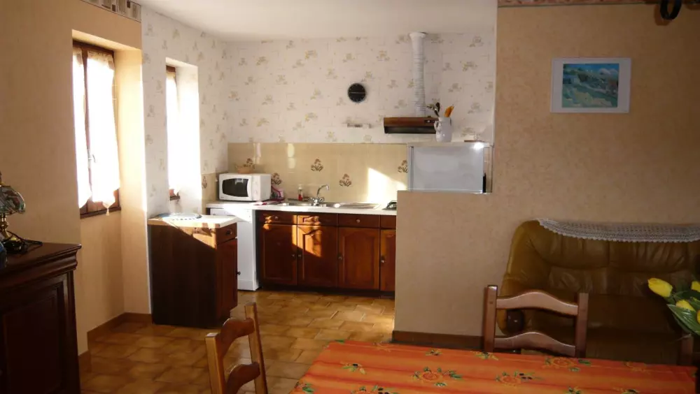 Séjour-cuisine(frigo-congélateur, L Vaisselle, four Micro Ondes) avec un canapé. 2 chambres (1 lit 2 pers.-2 lits 1 pers-1 lit BB). Salle de bains-wc. Chauffage électrique en sus. Taxe de séjour 0.50E/j/adulte. Situé à l'étage d'un ancien bâtiment agricole, accessible par un escalier extérieur, le gîte est situé aux abords du village avec loggia de 15 m2. un salon de jardin, barbecue et un terrain non clos en bas.