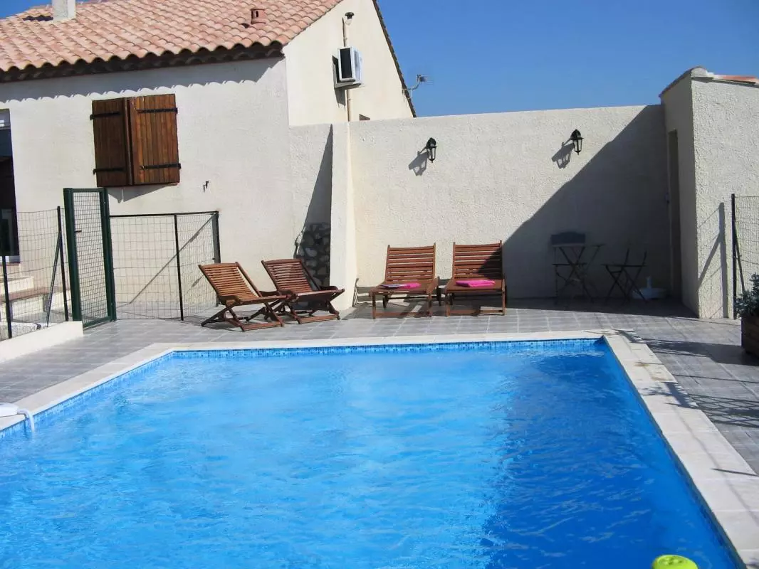 Séjour-cuisine toute équipée,avec produits ménagers fournis. 3 chambres avec 2 lits 140, 2 lits 90. Salle de bains-WC commune à 2 chambres. 1 Salle de bains et 1 WC ind. Taxe de séjour. Climatisation dans le séjour. Chauffage électrique en sus. Aux abords du village à 7 km des plages Méditerranéennes, proche des vignes du propriétaire, pavillon totalement de plain-pieds avec vue sur les moulins et la chapelle St Martin. Terrain attenant complètement clos, terrasse et cour intérieure en patio avec salon de jardin et plancha électrique. Piscine privative 4 x 6 sécurisée devant le gite, ouverte de juin à septembre. Garage.