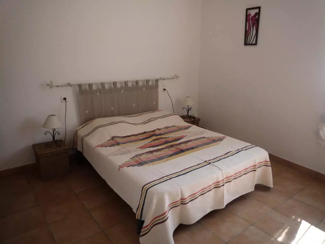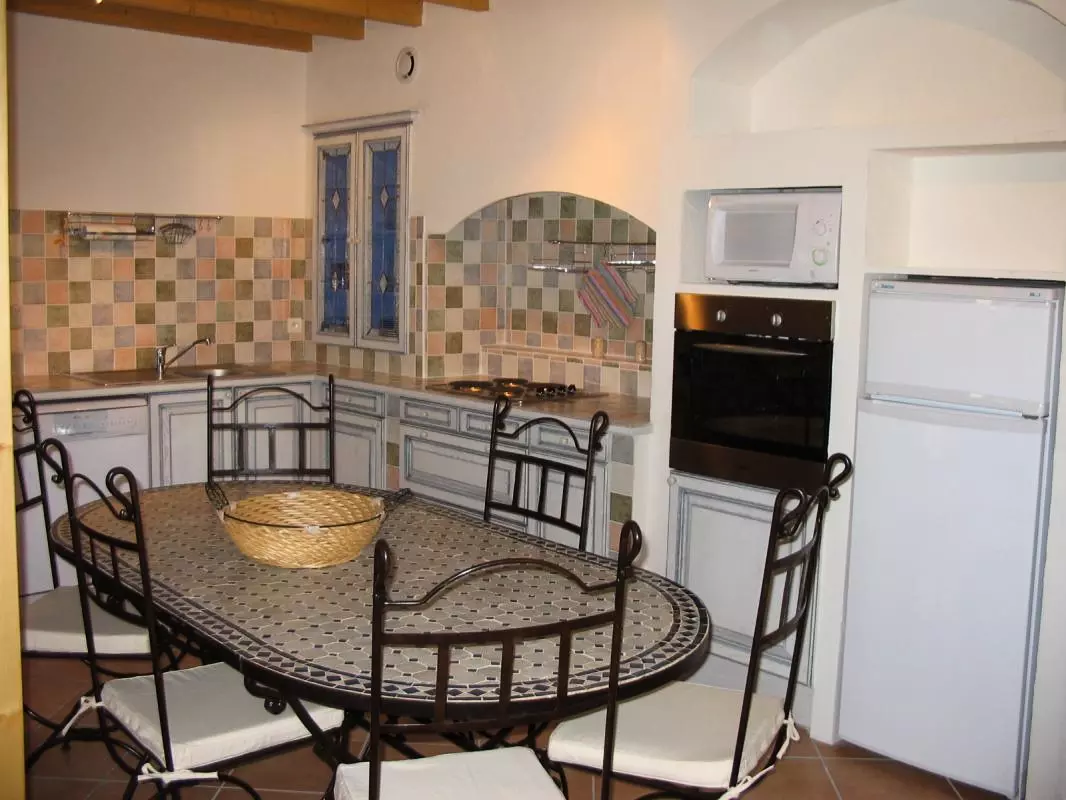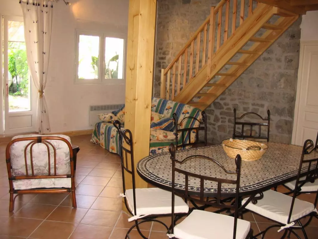 Grand séjour-cuisine donnant sur le jardin (Lave Vaisselle,four Micro ondes, TV-DVD), mézzanine avec 2 lits 1 pers. Cellier avec Lave Linge. 2 chambres(1 lit de 2 pers et 2 lits de 1 pers). Salle d'eau. WC ind. Garage privatif. Chauffage électrique inclus. Gîte de grand confort situé aux abords du village, mitoyen. Dans un environnement de vignobles et de garrigues sur la route des châteaux du Pays Cathare, à 2 pas de la célébre abbaye de Lagrasse. Les propriétaires viticulteurs vous feront partager leur passion de ce terroir. Terrasse et jardin clos 100m² avec salon de jardin.
