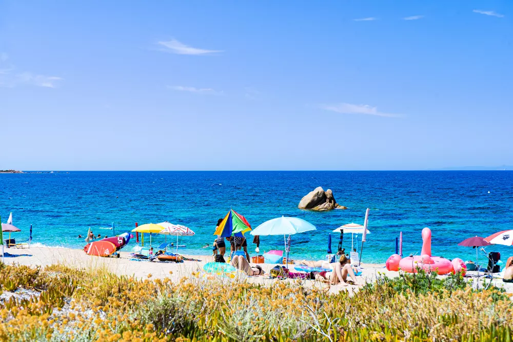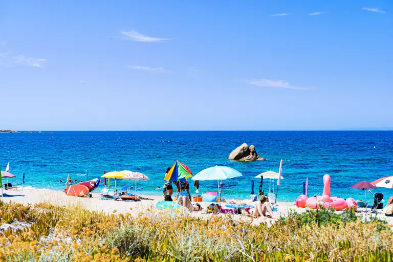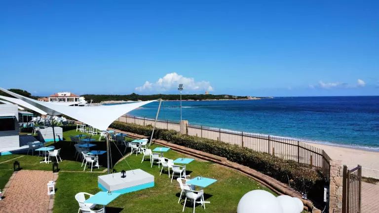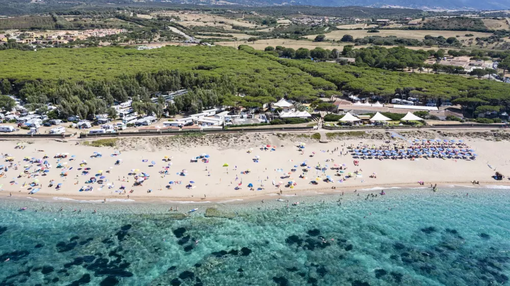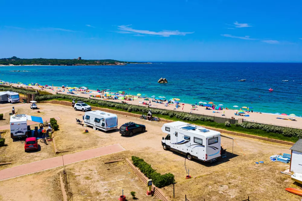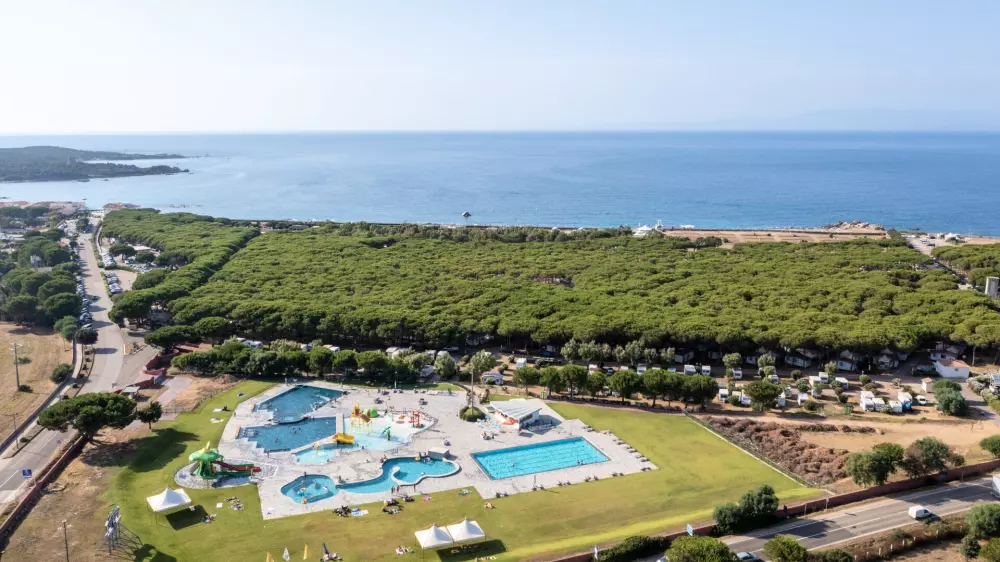 Le Camping Village, à l'ombre des pins maritimes, donne directement sur la plage, offrant le spectacle coloré et contrasté de la mer de Sardaigne.