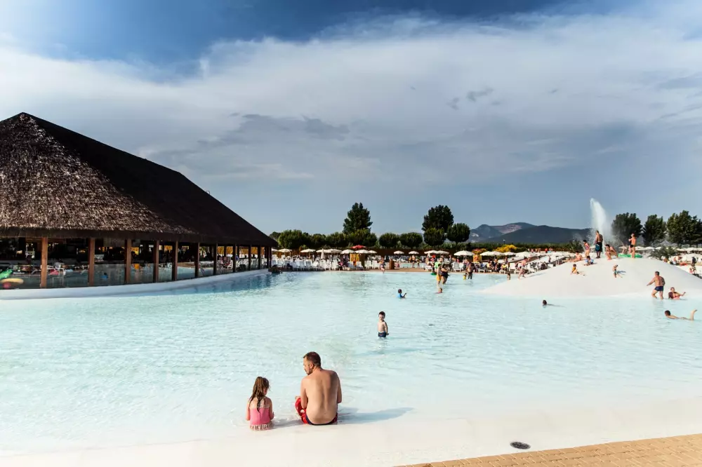 Le complexe aquatique comprend des lagons, des îles, des toboggans, des jeux d'eau pour les enfants, un bain à remous, une piscine olympique pour les adultes, et une piscine chauffée et couverte en début de saison (selon la température extérieure). Les piscines sont équipées de parasols et transats (selon disponibilité) et un grand bar, et sont ouvertes du 20/04/24 au 22/09/24.