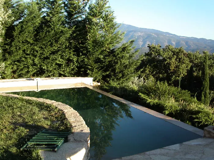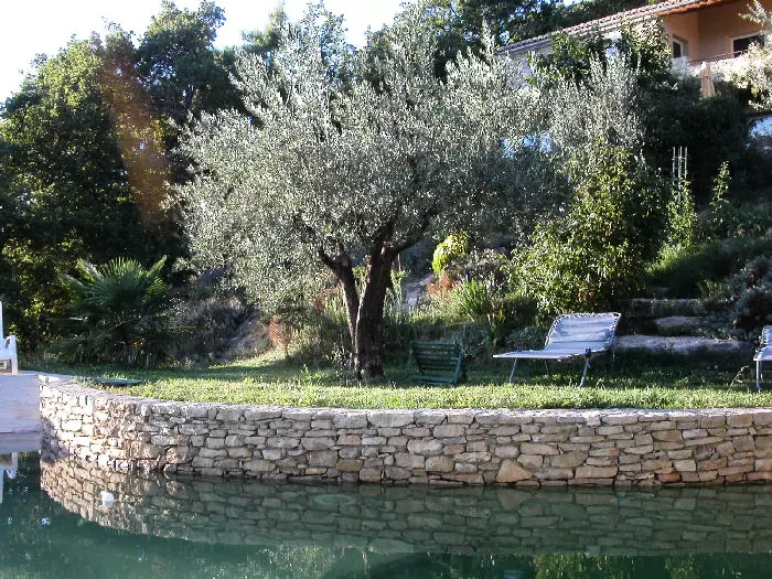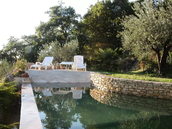 Piscine à débordement de forme originale. 8 m x 2 m – 8 m x 3,50 m. Profondeur maximum 2,00 m. Protection par alarme.