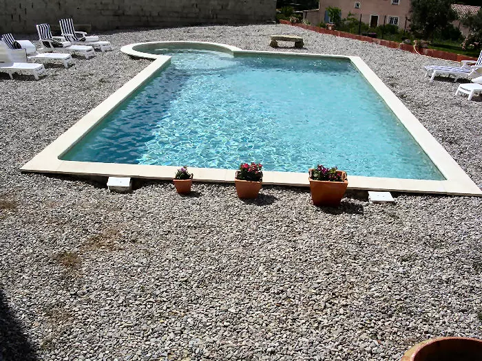 Piscine commune de 10 m x 5 m – Profondeur de 1,50 m – Fond plat – Protection par alarme – Plages : galets et pelouse