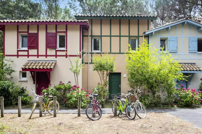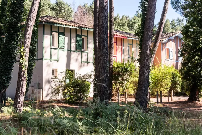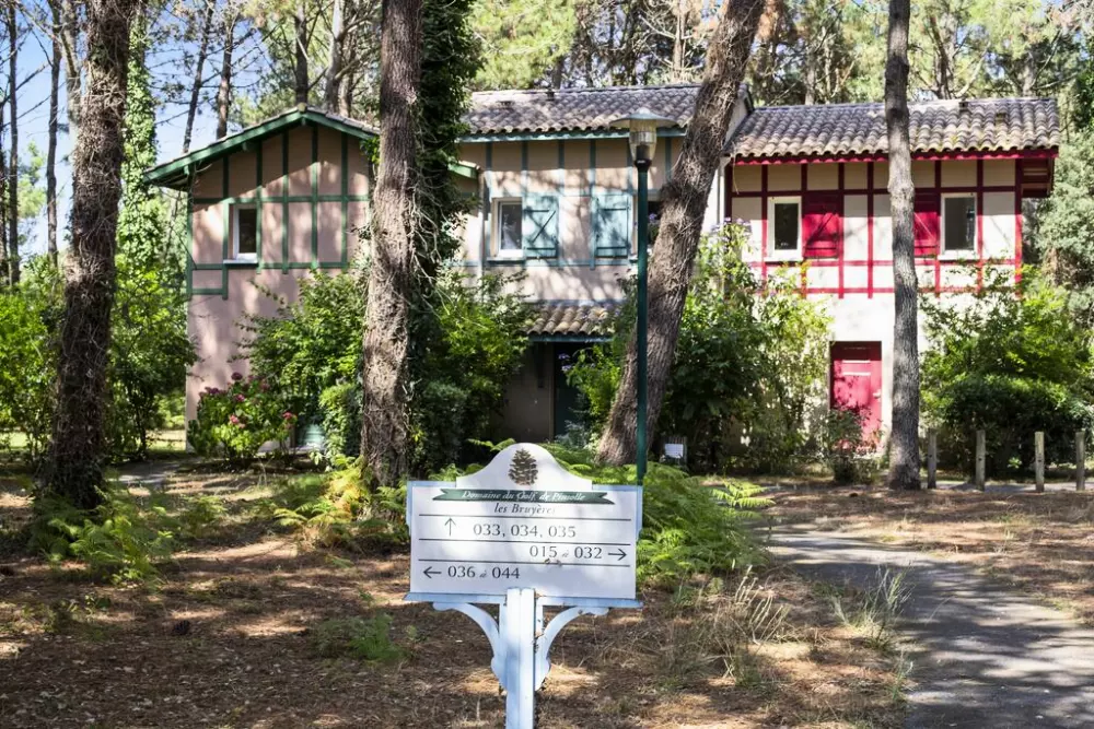 Située à Soustons, au cœur d'une forêt de pins et en bordure d'un golf, cette charmante résidence vous offre un cadre calme pour des vacances reposantes. Elle arbore une architecture caractéristique des Landes et se compose de plusieurs petits bâtiments et de maisons à colombage, garde-corps en bois et tuiles rouges.