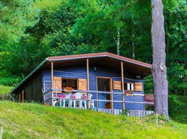 Les 16 chalets, accueillant de 4 à 6 personnes, sont harmonieusement disséminés dans une chêneraie et offrent une vue imprenable sur la campagne environnante et la rivière.