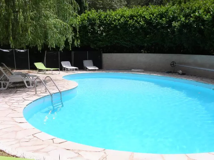 Chauffée à 26° - De forme originale - 12 x 4 - Dalles de la piscine refaites - échelle - profondeur maximale : 2,50 m - protection par barrières en filet normalisées.