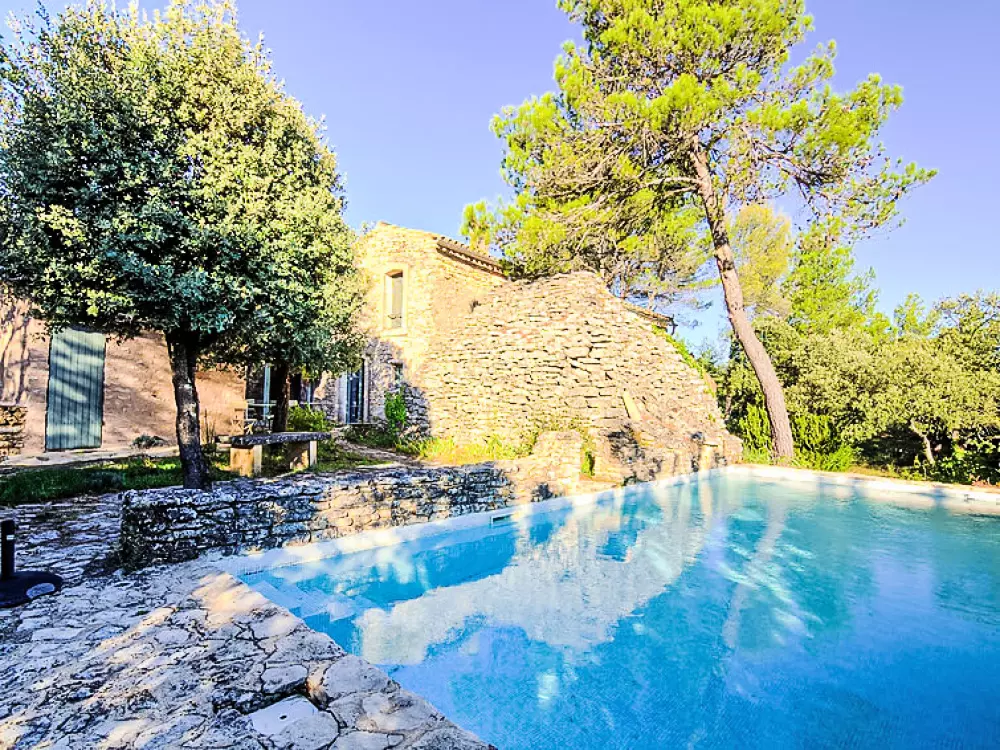 Maison de campagne "Le Bon Puits". En-dehors de la localité, à 3 km du centre de Menerbes, situation isolée. A usage privé: terrain à l'état naturel 2 ha, piscine (9 x 4 m, profondeur 170 cm, 01.05.-15.10.). Douche extérieure. Chauffage payable localement (01.11.-30.04.). Place de parking sur le terrain. Magasin d'alimentation 3 km, restaurant 3 km. Veuillez noter: voiture recommandée. La maison est accolée à une borie.