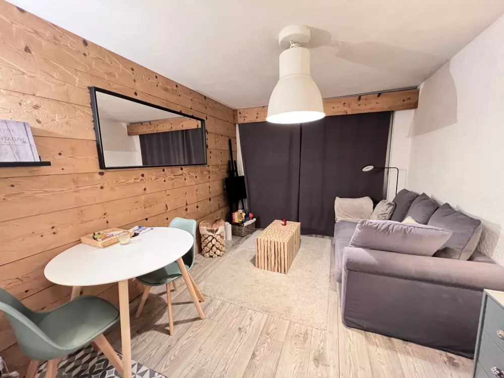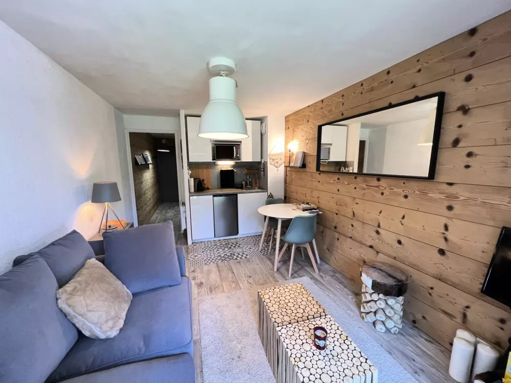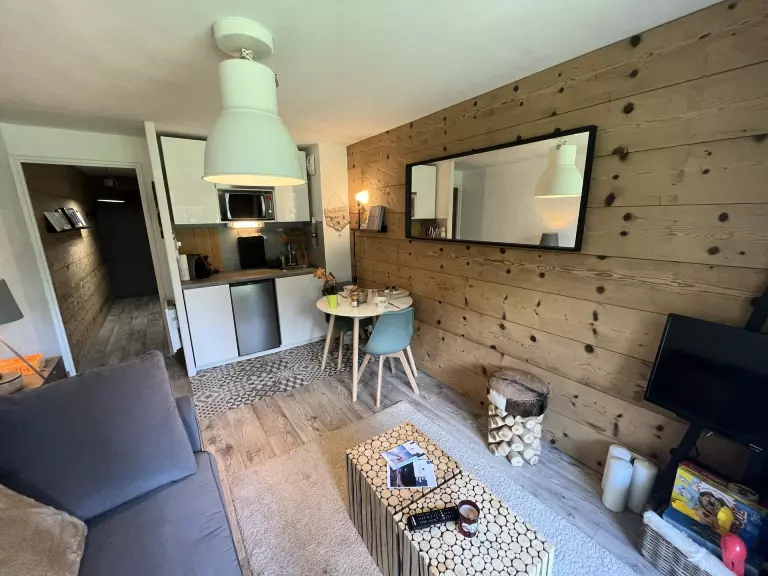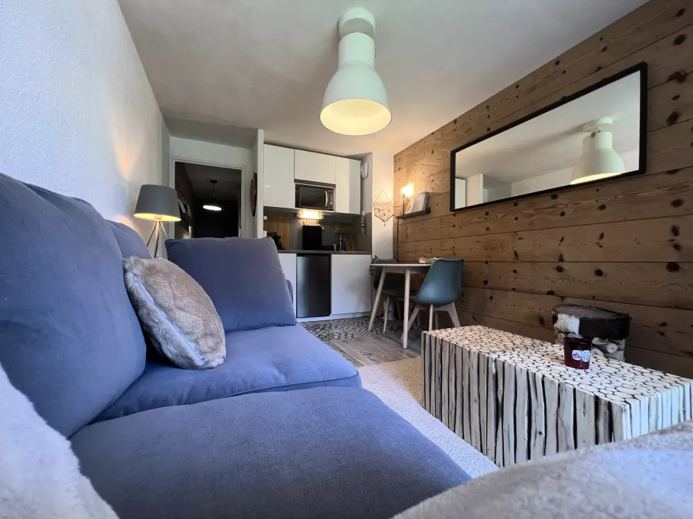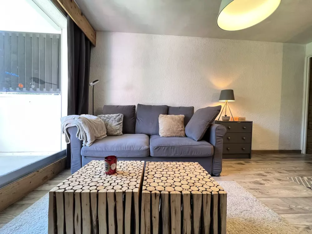 Un séjour avec un canapé convertible, TV, terrasse avec magnifique vue sur les pistes