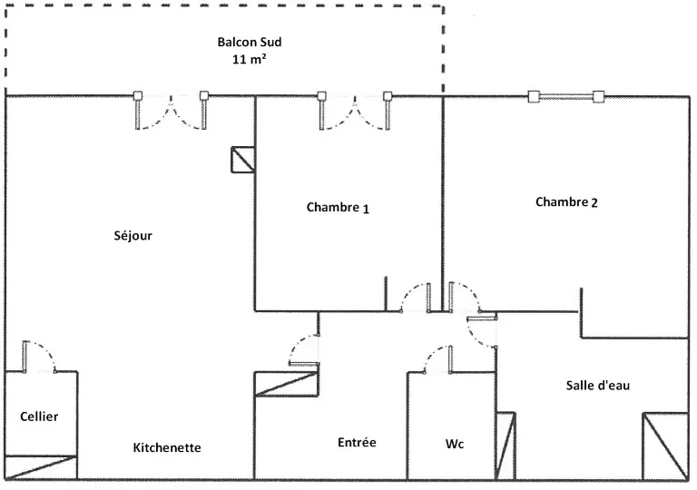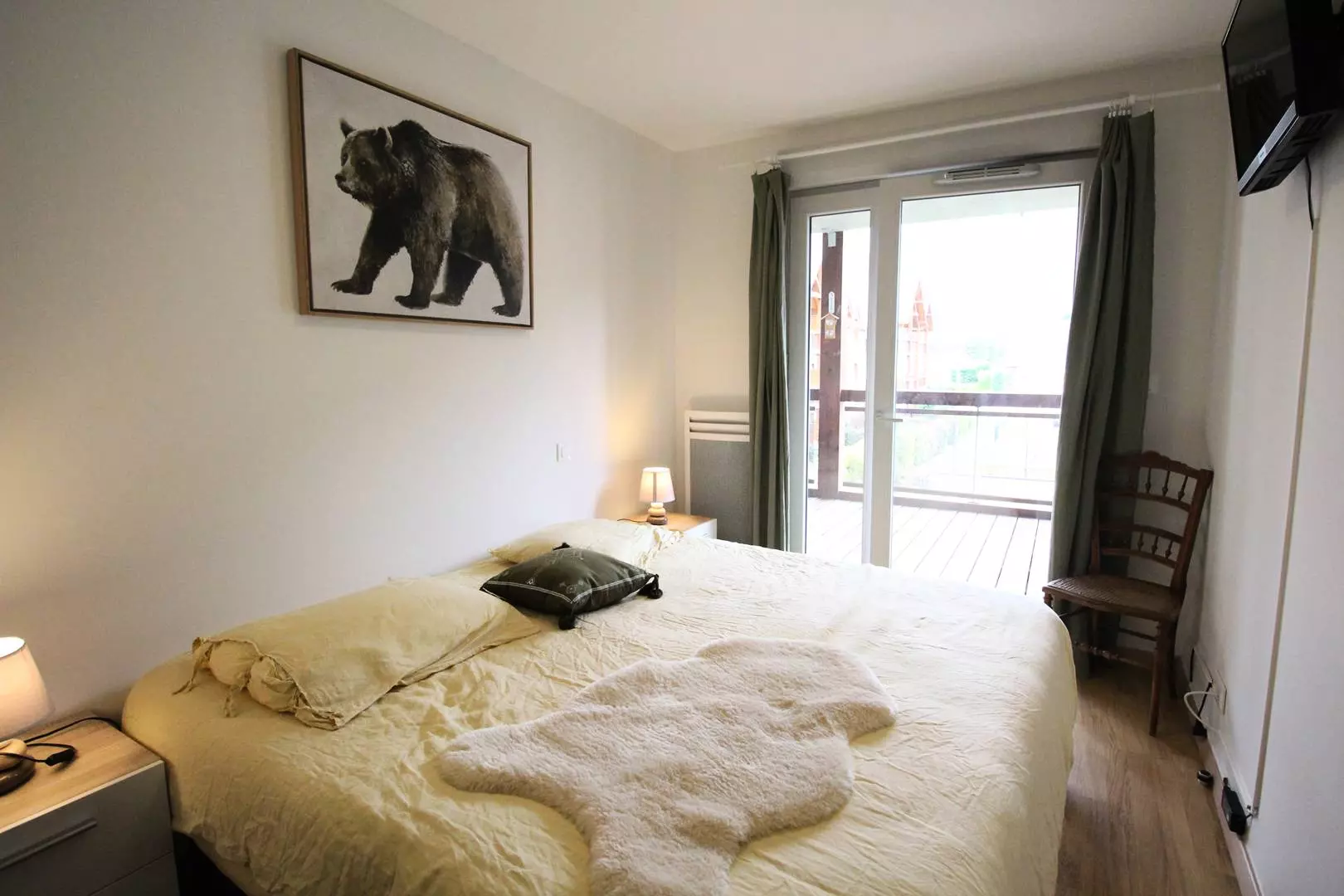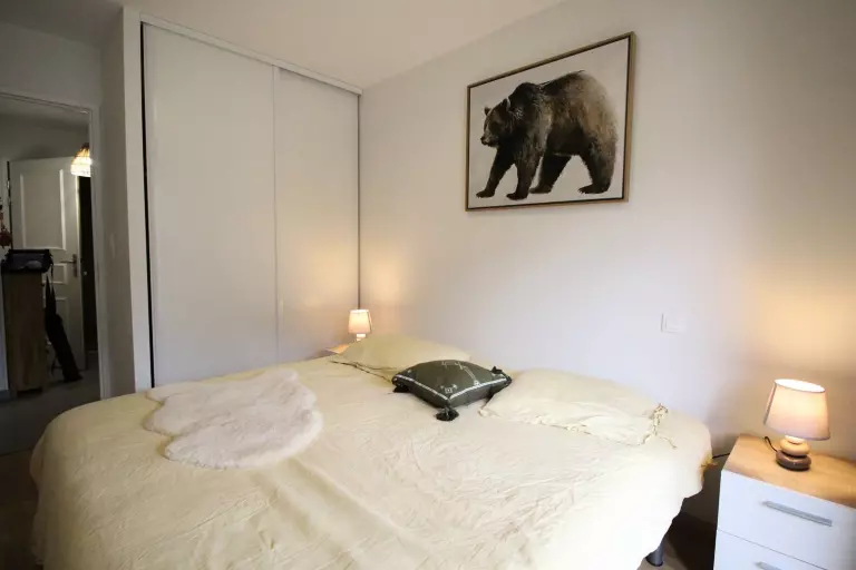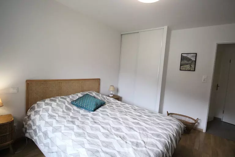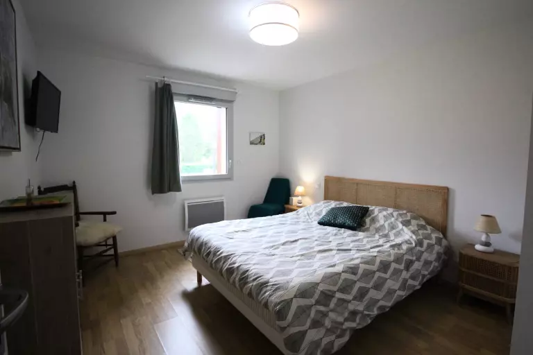 Cet appartement en très bon état comprend une entrée avec grand placard, une chambre sud avec un lit 160, télévision et placard penderie, une chambre sud donnant sur le balcon avec 2 lits en 90, télévision et placard penderie.