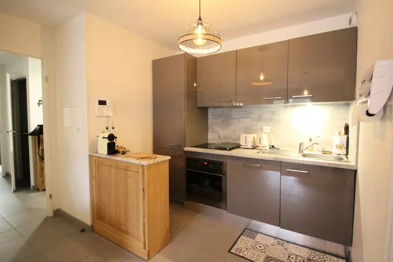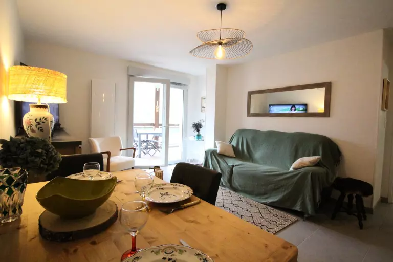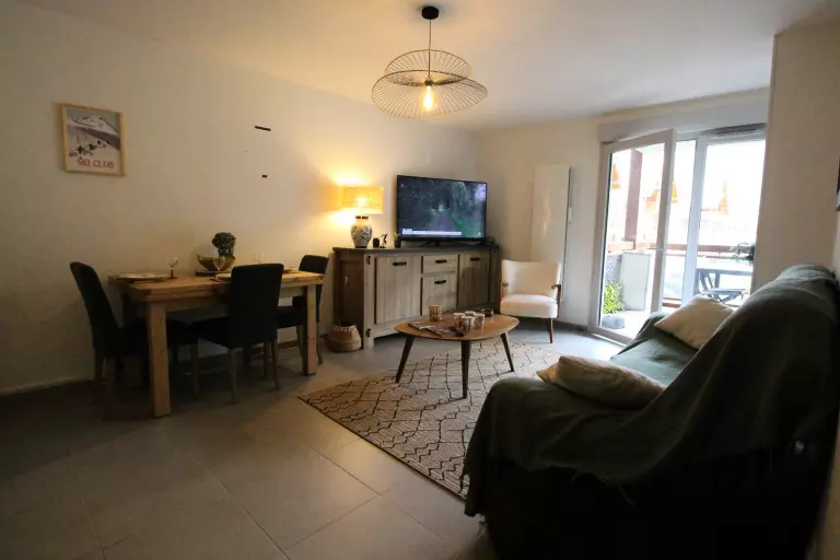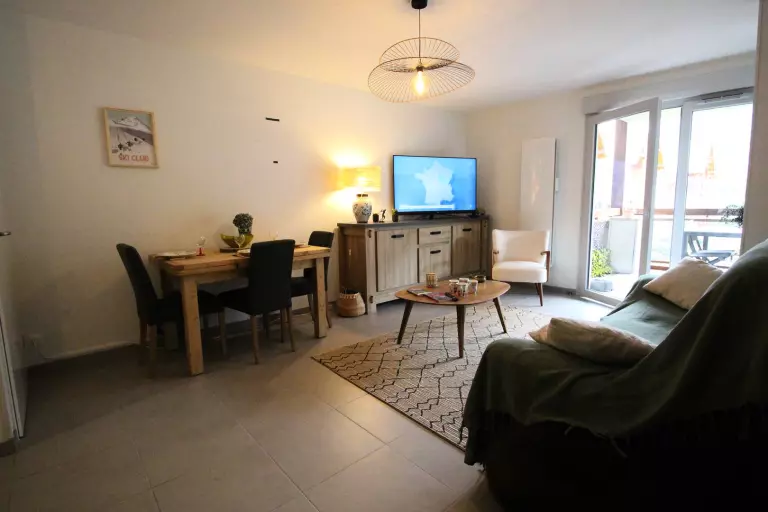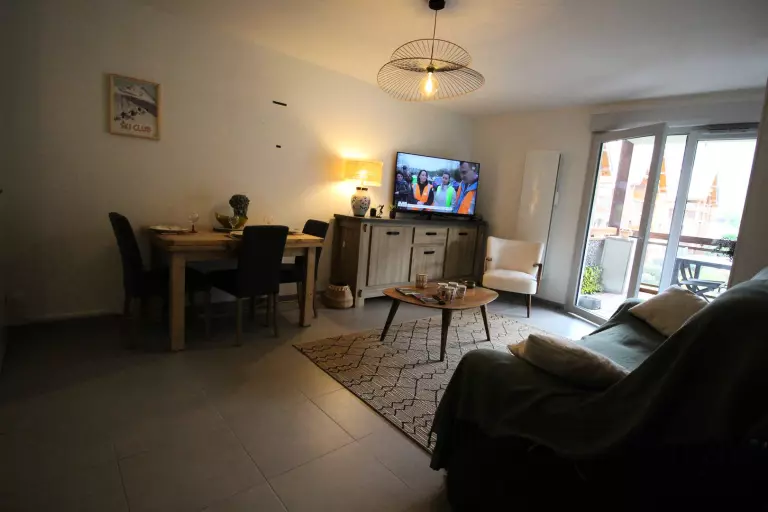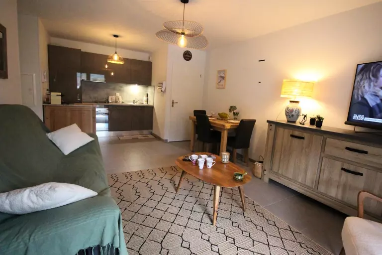 Un séjour avec un canapé, télévision, rangements, une kitchenette équipée donnant sur le séjour (plaque induction, réfrigérateur congélateur, lave-vaisselle, micro-ondes, four, nespresso, cafetière, grille pain, bouilloire, appareil à raclette, lave linge/sèche linge). le séjour donne sur le balcon équipé d'un salon de jardin.