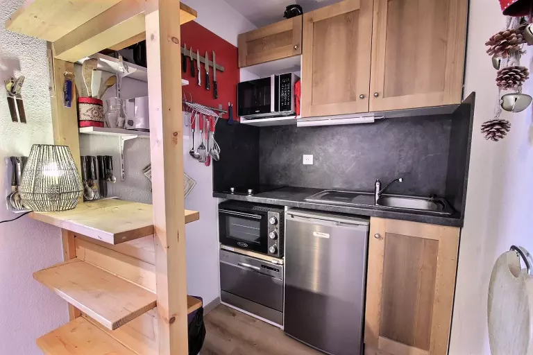 Il est équipé de plaques à induction, d'un micro-ondes, d'un lave vaisselle et d'un réfrigérateur.