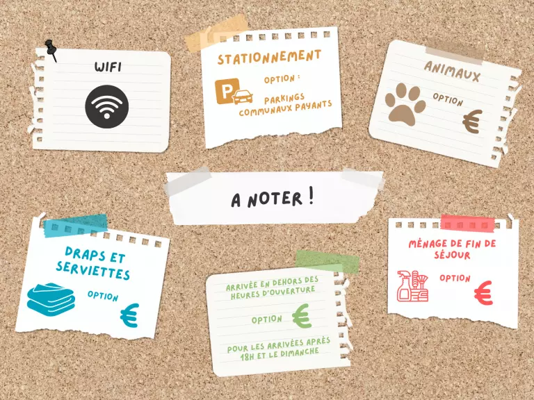- Ménage de fin de séjour, forfait selon la surface du logement (50€ à 150€), à commander 3 jours avant le départ,