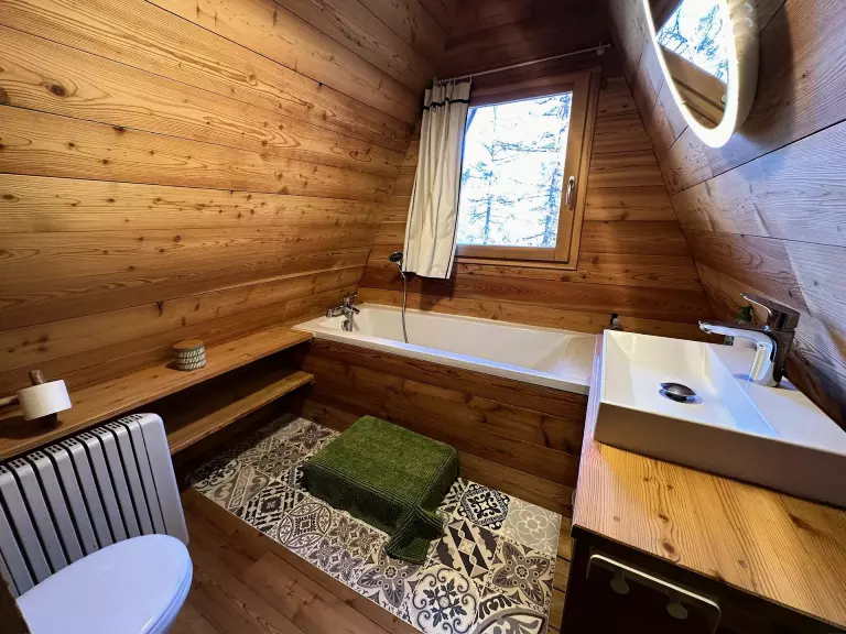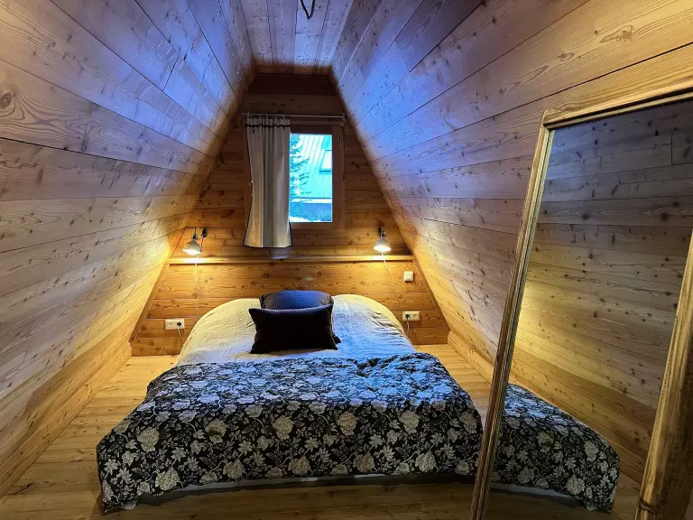 Au troisième et dernier étage : une suite parentale sous les toits avec lit double, baignoire et sanitaires. Vue traversante de part et d'autre du chalet.