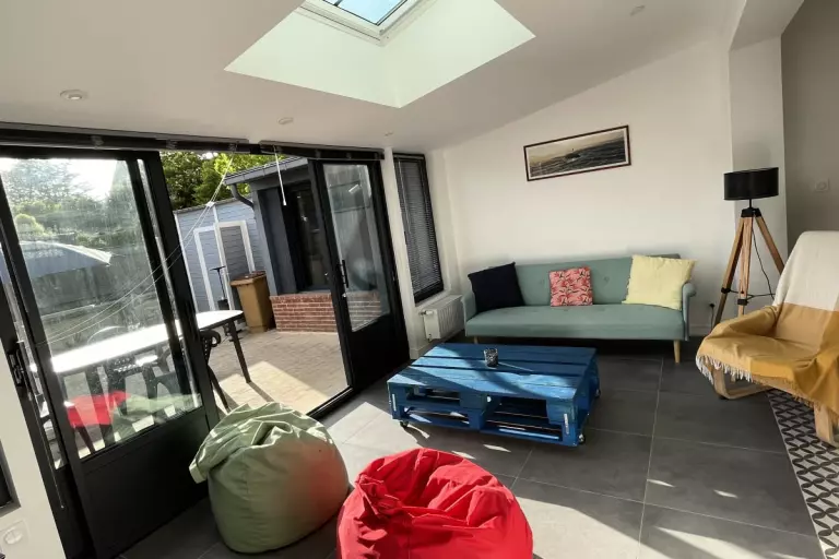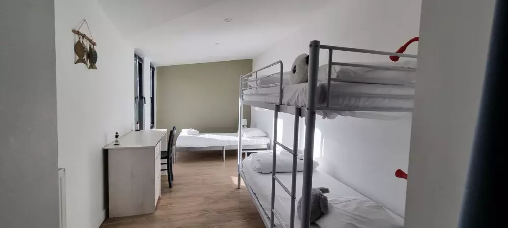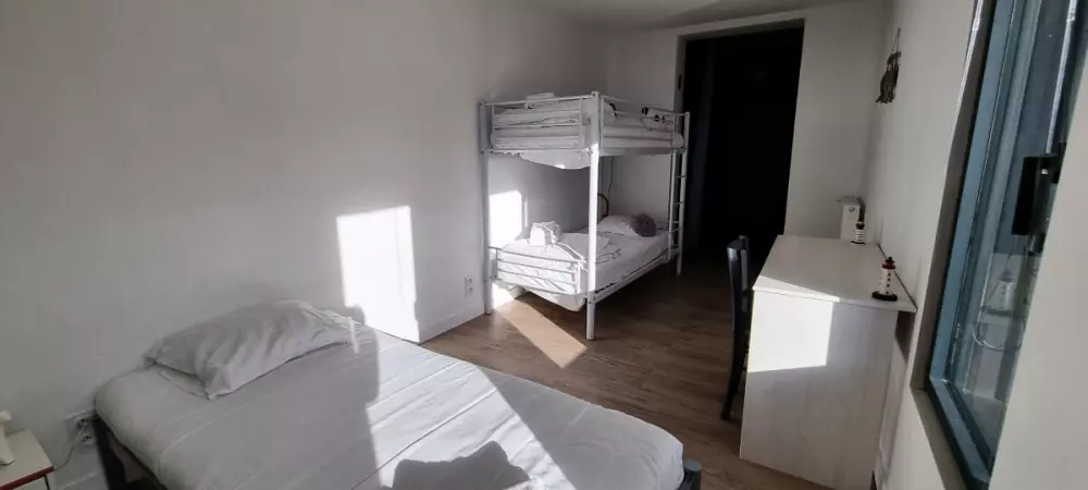 - deux chambres : 1 avec un lit double; 1 avec un lit superposé (= 2 lits simples), et un lit double; un lit pour bébé est disponible en plus;