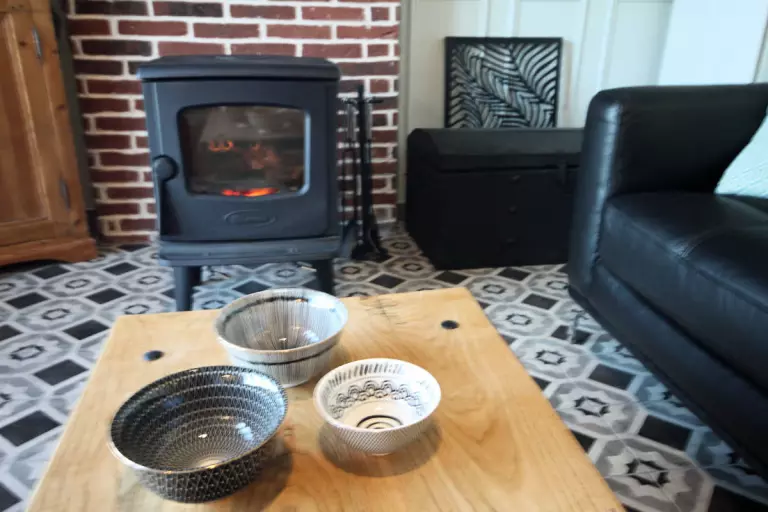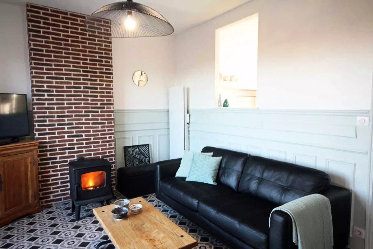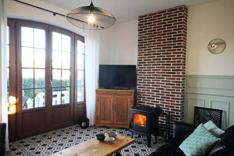 - séjour-salon avec poêle à bois, TV grand écran, chaînes internationales et prise USB, chaine-hifi, lecteur DVD, vue dégagée sur la station balnéaire,