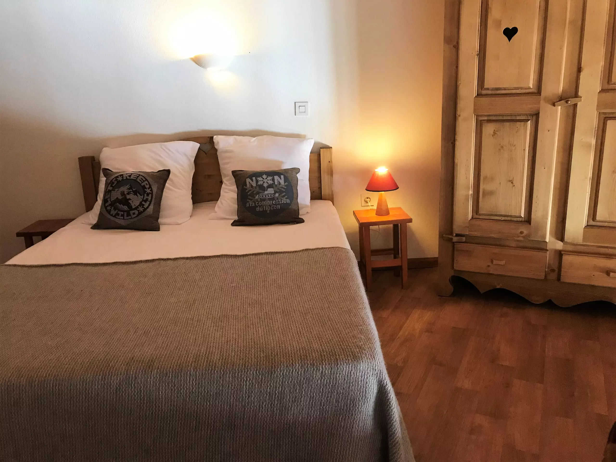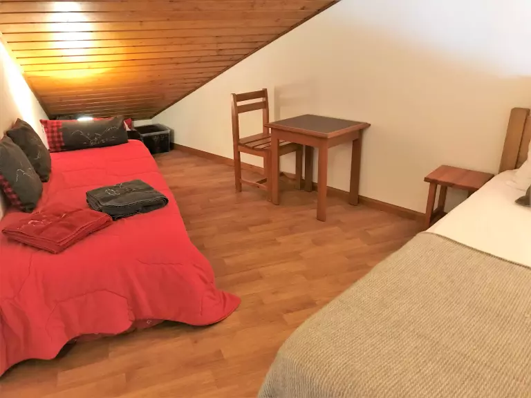 Sur la mezzanine de l'appartement se trouve un espace chambre, équipée d'un lit double, d'un lit simple et d'un placard de rangement. Le velux illumine la pièce et vous offre une clarté d'autant plus agréable (non déneigé en hiver).