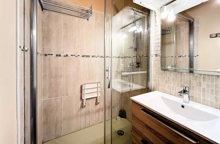 Deux pièces bien équipé et cosy, comprenant une entrée, une salle de douche (sèche-cheveux à disposition) et des toilettes séparées.