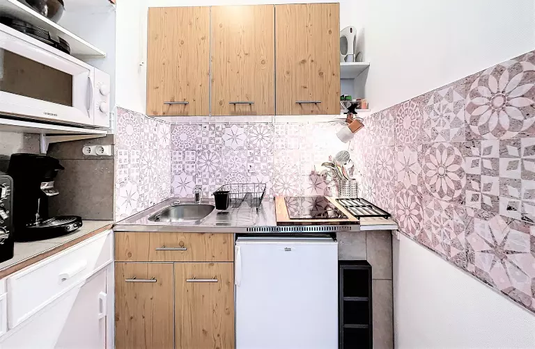 Le coin cuisine est séparé, équipé de 2 plaques vitro, frigo top, cafetière à dosette SENSEO®, d'un mini four, d'un micro-ondes, une bouilloire, appareil à raclette et à croque-monsieur....