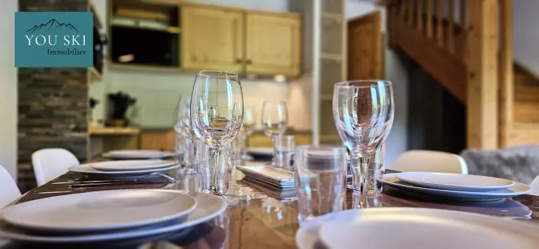 Au rez-de-chaussée, vous trouverez un séjour ouvert sur la cuisine et le salon, idéal pour se détendre après une journée sur les pistes ou une balade estivale, avec accès à un balcon offrant une vue exceptionnelle sur les sommets.