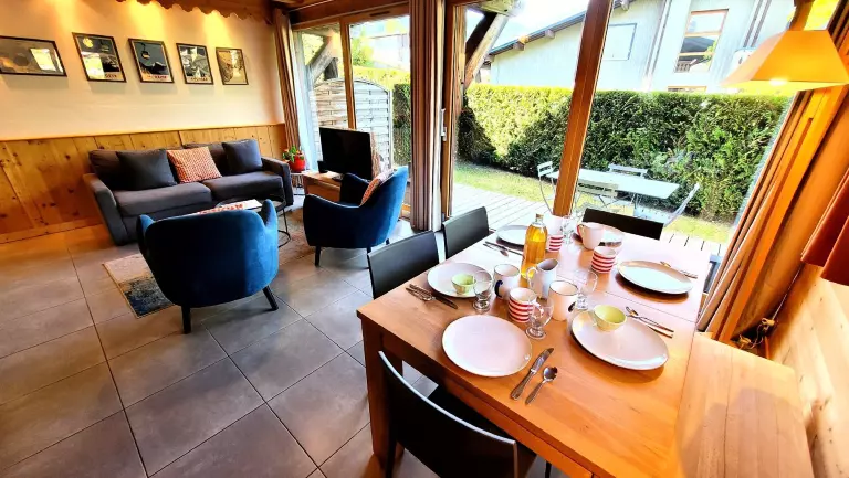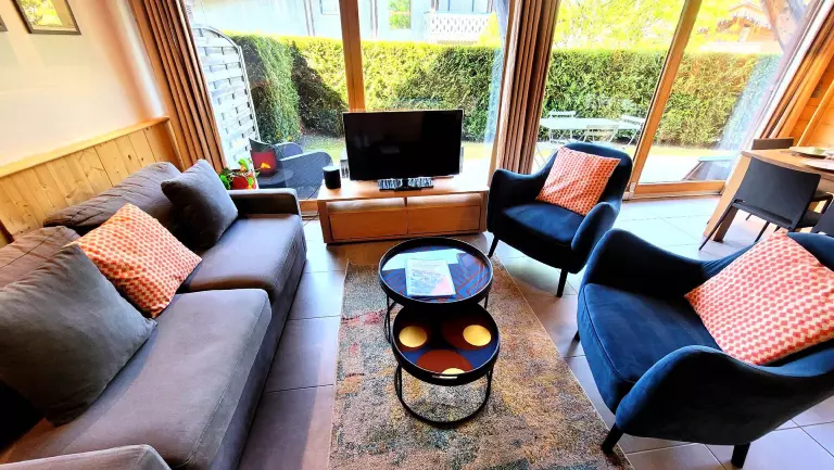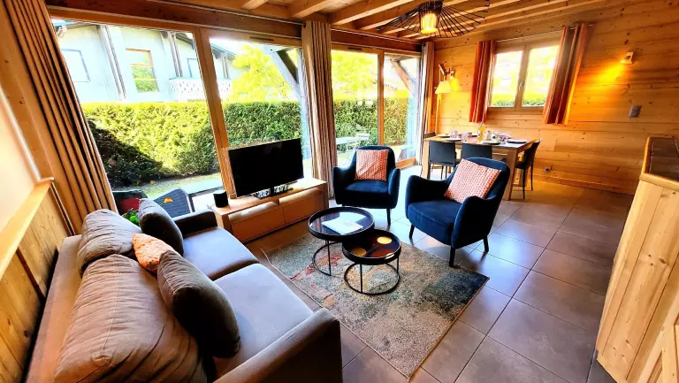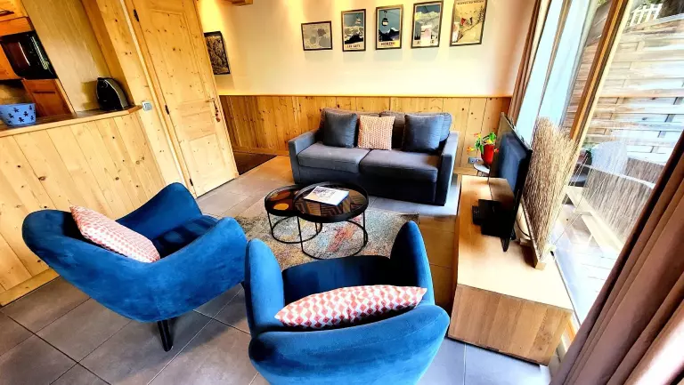 - Salon-séjour avec 1 canapé convertible en 160 cm, cuisine équipée ouverte sur le séjour. Accès sur la terrasse par les baies-vitrées