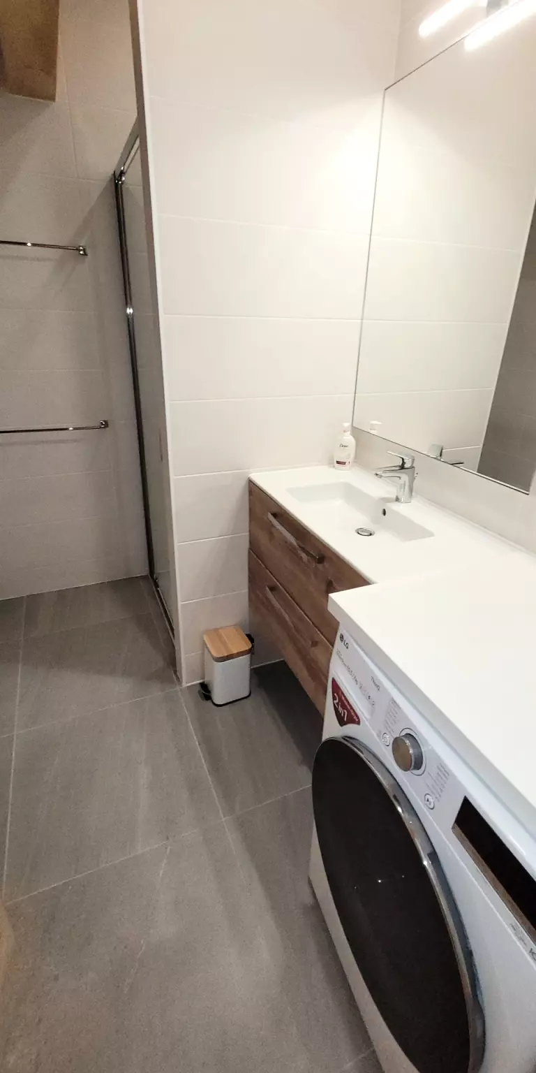 - une salle de douche avec vasque, seche serviettes et lave linge
