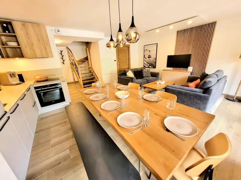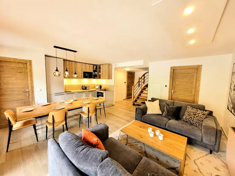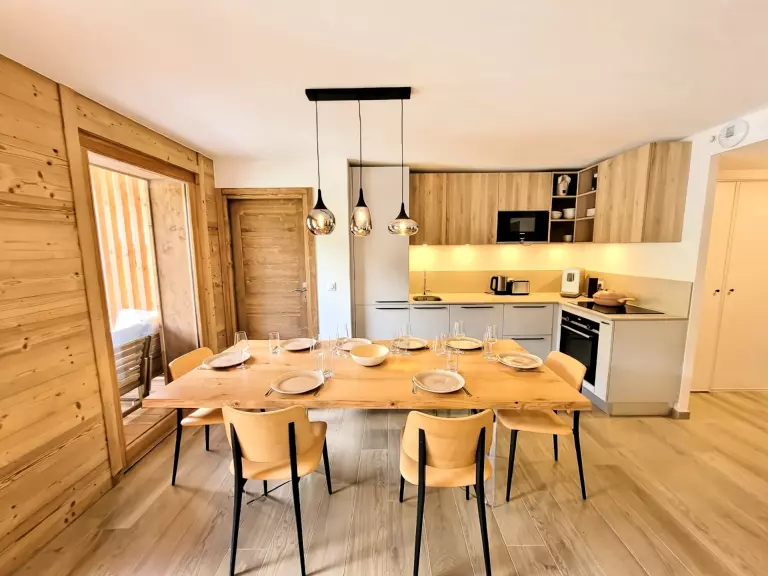 - Un salon/séjour avec cuisine ouverte, donnant accès au balcon exposé ouest et équipé d'un "télésiège-banc".