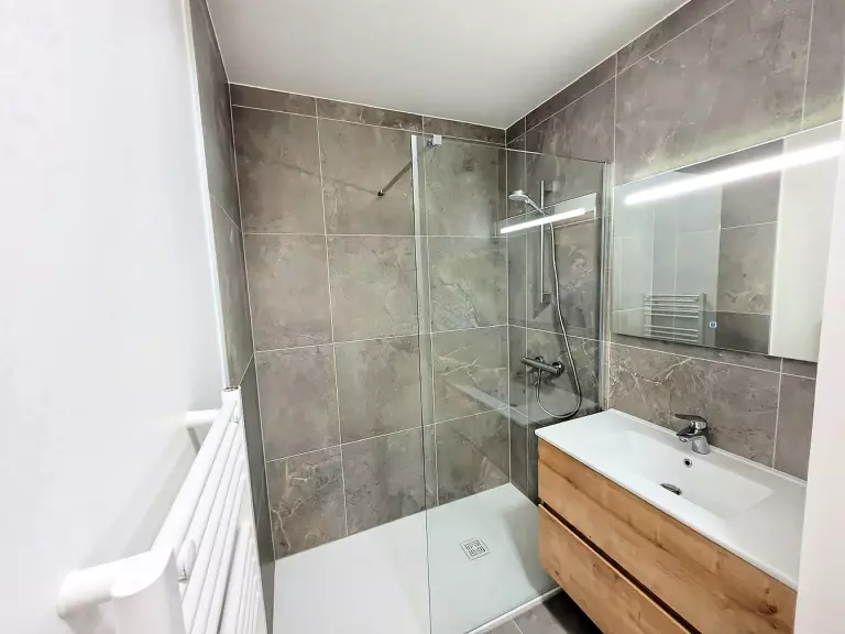 - une salle de douche avec vasque, sèche-serviette et WC