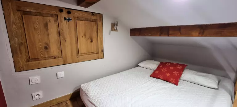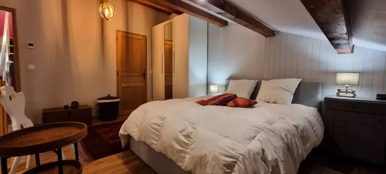 l'accès de La chambre en mezzanine se fait par un escalier dans la deuxième chambre est équipée de 1 lit double en 140 en sous pente (conseillée pour enfants de plus de 6 ans).